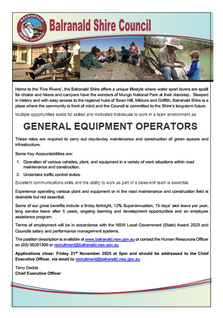Click on the below button to view the position description or contact Human Resources Officer on (03) 5020 1300 or recruitment@balranald.nsw.gov.au