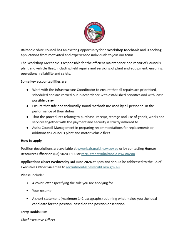 Applications close on Wednesday June 3rd, 2026 and should be addressed to the General Manager, via email to recruitment@balranald.nsw.gov.au
